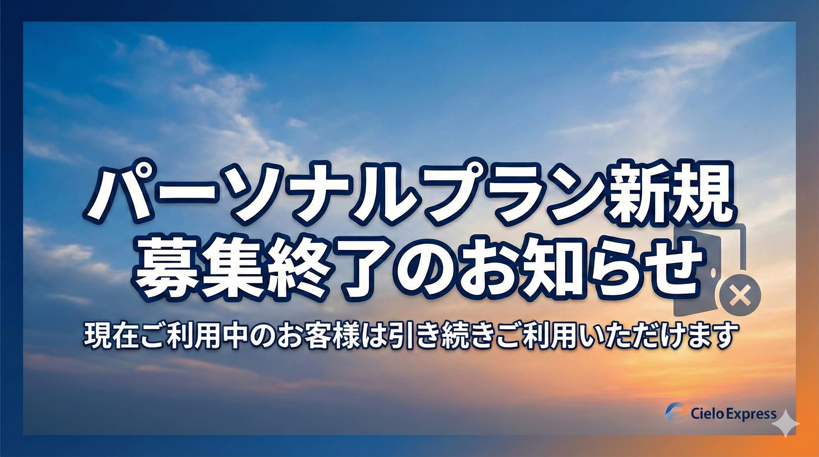 このたび、Cielo Expressではサービスの見直しに伴い、誠に勝手ながら「パーソナルプラン」の新規募集を終了させていただくこととなりました。